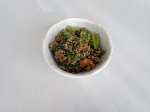 キヌア入りくるみサラダ副菜 材料 2人分 88kcal/人 キヌア 16g 水 50ml 青菜 120g 人参 20g くるみ 12g 味噌 6g 醤油 4g レモン汁 2g 作り方 ①キヌアを茶こしに受け洗う。鍋に移し水を加え火にかける。 鍋に移し水を加え火にかける。沸騰したら蓋をして弱火で15分炊く。 ②青菜は茹でて3‐4㎝の長さに切る。人参は茹でて細切りにして茹でる。 ③くるみをすり鉢でよく擂る。調味料を加えさらに擂り、①、②を加えよく混ぜ合わせる。 ~ひとくちメモ~ くるみを擂ることで調味料とより馴染みやすくなります。 味噌は麦、米、白みそなどお好みのものをお使いください。 Tweet